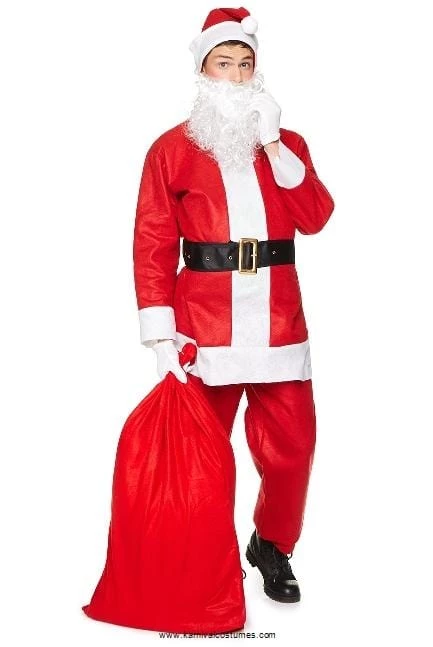 Quick, easy, budget Santa Suit Costume. Perfect for an quick change into Santa Claus this Christmas. This light weight costume has all the necessities for an express transformation. Costume includes Santa’s trademark red jacket top with white trim, matching hat, long white wavy beard, belt and red pants. Just the thing for Work Christmas parties, Christmas pub crawls and any other festivity the silly season calls for! Finish your look with accessories such as Santa’s wig, gloves, faux belly, bell and glasses, all sold separately.