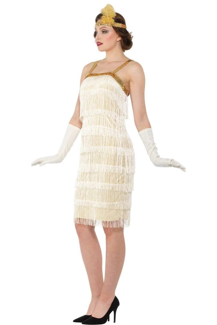 Get ready to kick up your heels and dance right into the 1920’s in this elegant Gatsby inspired costume. Comes complete with an elegant ivory coloured velveteen stretch flapper dress covered front and back with fringing and with gold sequin trim, long gloves and gold sequin headband with feather.