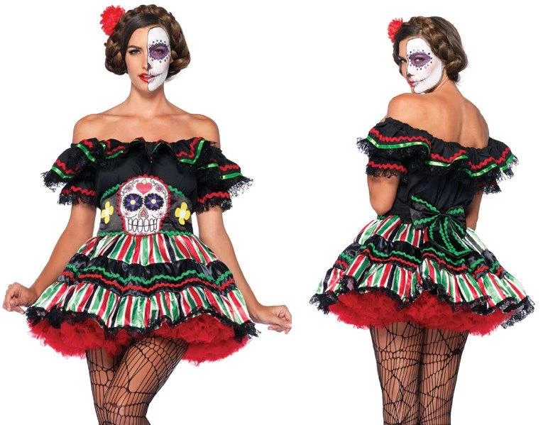 Pretty Mexican Day of the Dead style peasant dress in a range of sizes. Costume is stretch off-the-shoulder peasant girl dress with Sugar Skull belt and petticoat to go underneath.