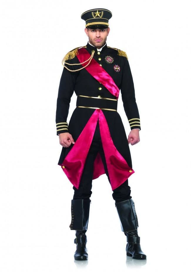 Despot dictator or benevolent dictator? Either way you’ll rule in this dashing military costume. Costume includes black tails jacket with red satin lining, attached epaulets, sash and patches, belt, hat and black trousers. These boots n/a but other boots or bootcovers available with hire.