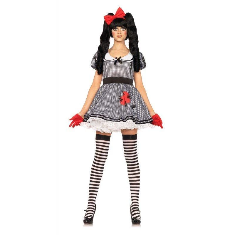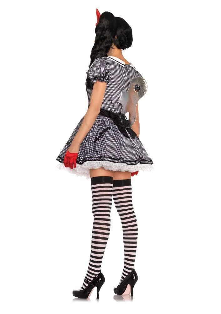 Wind-Me-Up Dolly Halloween costume for adults includes gingham dress with heart detail and attached petticoat and silver turn key accent, headband, a wig. Shoes available at additional hire. Make-up, gloves, hosiery and all other accessories sold separately.