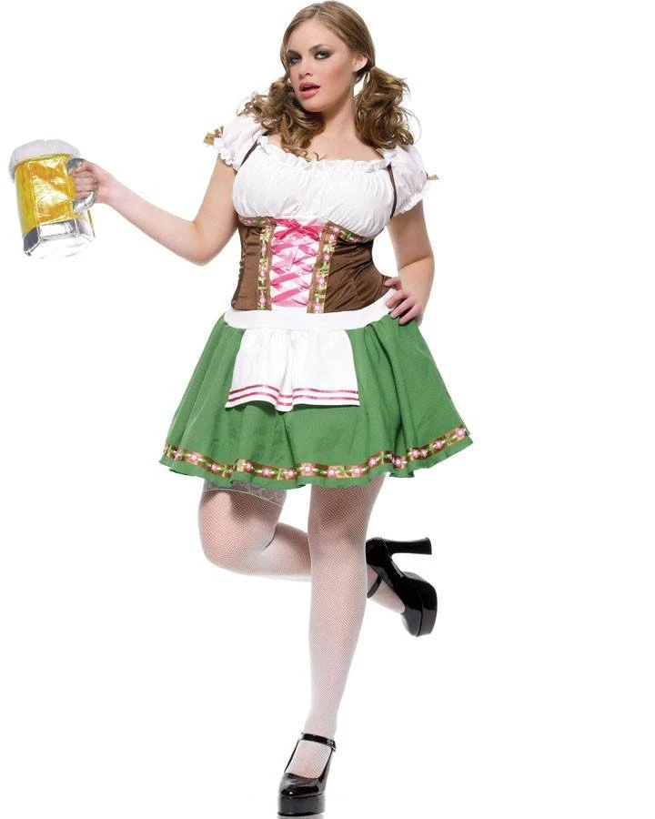 A sweet and sassy version of a traditional German Beer Girl plus size costume for Oktoberfest. This delightful plus size Gretchen costume is peasant girl style dress with ribbon lacing and skirt with matching brocade trim and attached apron. Hosiery, beer stein purse, petticoat and all other accessories sold separately.