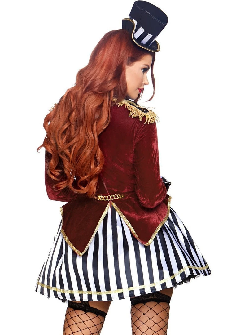 Command your audience in this show stopping 3 PC Night Ringmaster women’s costume. This sexy burlesque circus look includes a gold trimmed velvet tuxedo dress with sequin lapels and striped satin skirt, choker bow tie, and matching top hat. This deluxe Leg Avenue costume is fitted and figure enhancing. Add a petticoat for extra drama and complete your Big Top look with fishnets, gloves, and whip, all sold separately.