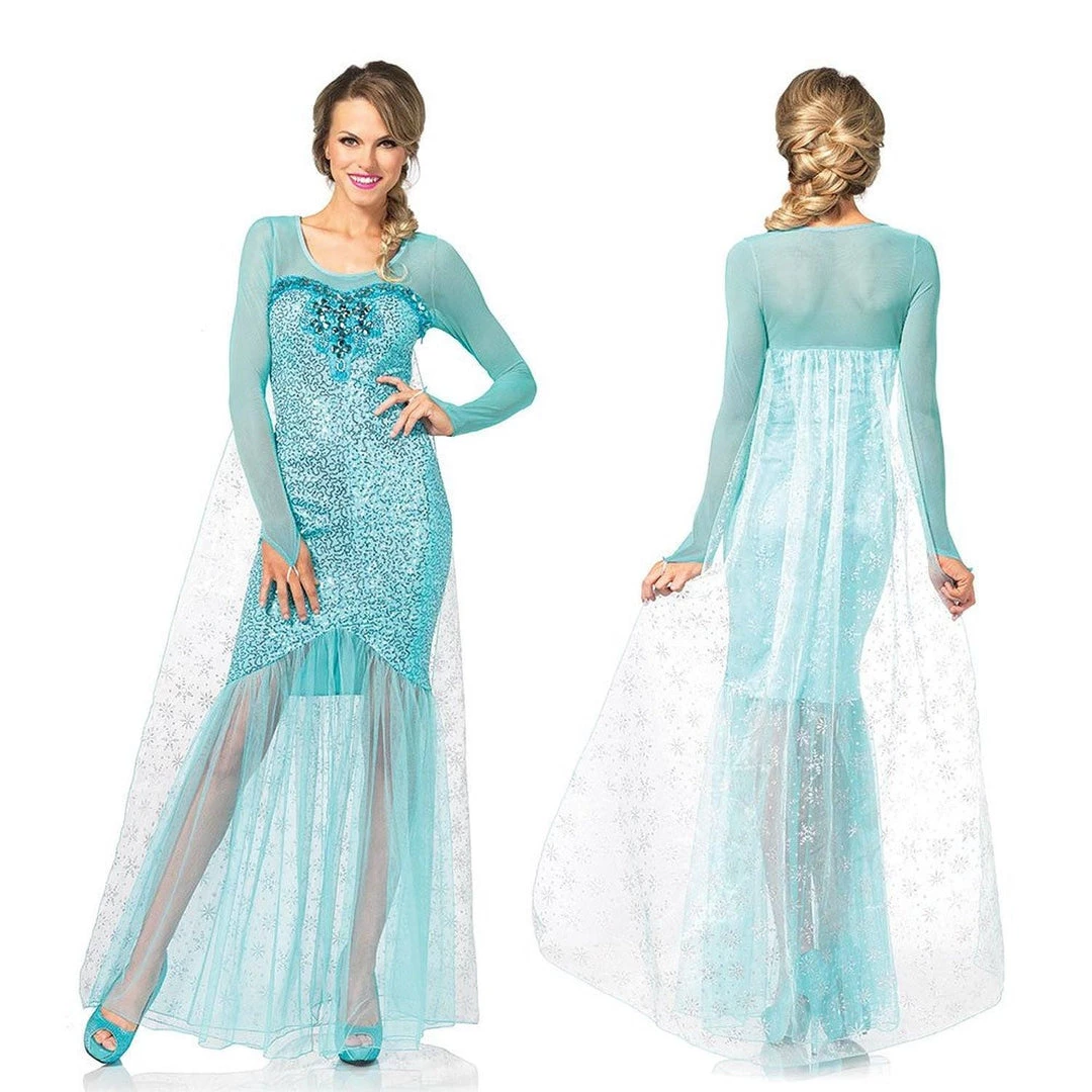 Just like Elsa from Disney’s Frozen, this delightful costume is a long fitted stretch dress with sheer sleeves and skirt and sequinned bodice. Rhinestones embellish the top of the dress and a sheer cape with embossed snowflake print is attached. Wig also available with hire.