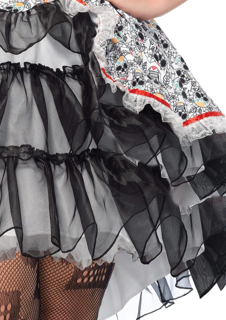 Celebrate Mexican Day of the Dead or Halloween in this fun and flattering Sugar Skull Senorita costume available in two curvy sizes. Includes: sugar skull print dress with layered ruffle skirt with lace sleeves and floral straps. Skirt is lower at the back for modesty and comfort. Comes with matching floral headband. Make-up, hosiery, petticoat and all other accessories sold separately. This is a quality Leg Avenue costume.