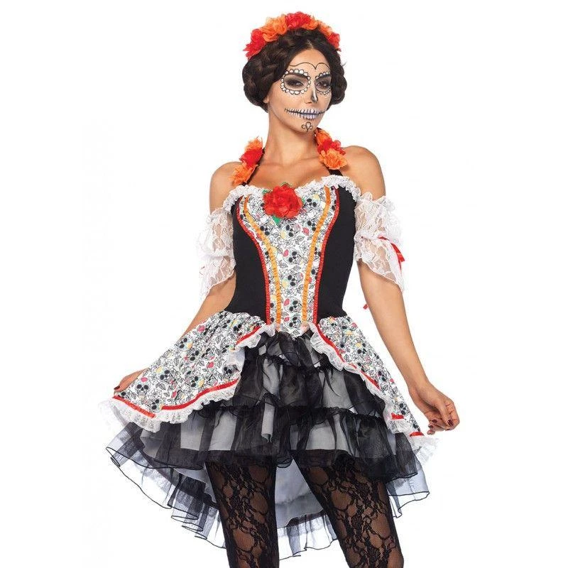 Celebrate Mexican Day of the Dead or Halloween in this fun and flattering Sugar Skull Senorita costume. Includes: sugar skull print dress with layered ruffle skirt with lace sleeves and floral halter straps. Skirt is lower at the back for modesty and comfort. Comes with matching floral headband. Make-up, hosiery and all other accessories sold separately.