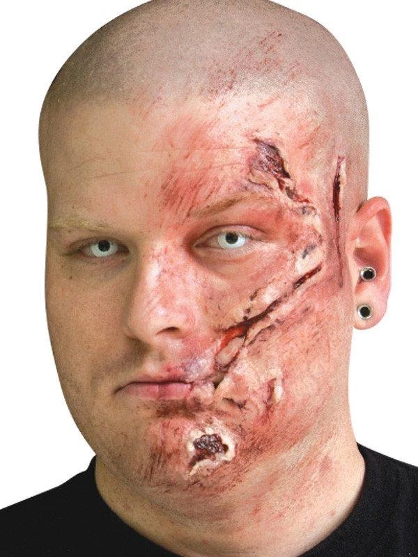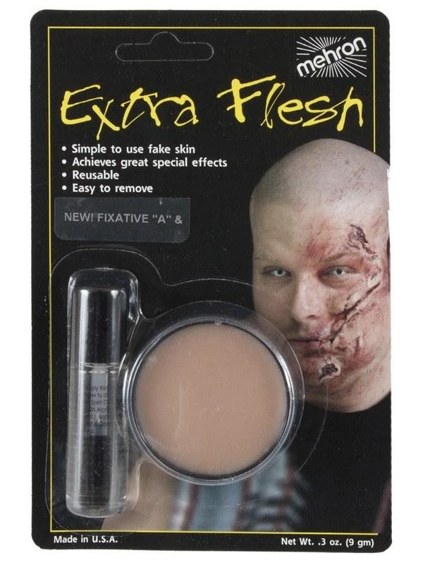 This product contains 9g of Mehron Extra Flesh and 4ml of Mehron Fixative. Use Extra Flesh to create cuts, scars, wounds, or for instant cosmetic changes to your face! Just rip off a chunk, dab it on with the fixative and blend it out.