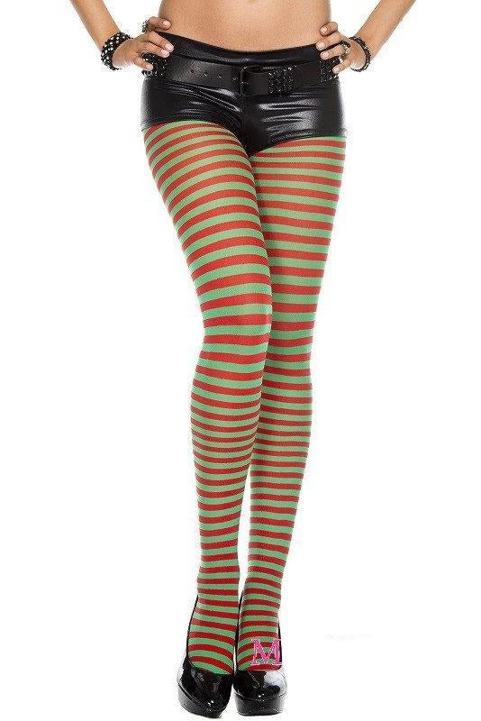 Red and green striped opaque tights. Perfect for a Christmas elf or Santa’s helper.