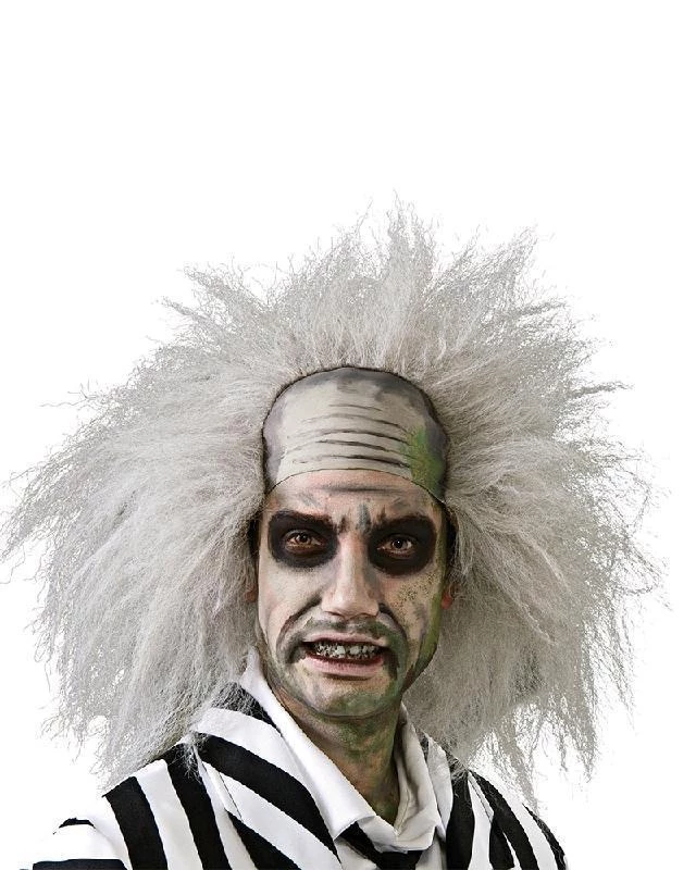 Beetlejuice costume wig – skin coloured rubber “bald patch” surrounded by crazy grey hair. Make up on wig and face sold separately. Officially licensed Beetlejuice product.