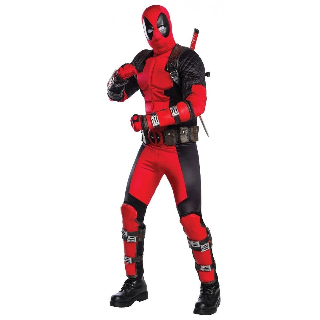 This is a quality costume. The jumpsuit is made from heavy grade spandex, the chest and the upper arms are padded. The Collector’s Edition Deadpool costume includes: padded jumpsuit, rubber belt, stretch shin guards and gauntlets with vinyl fronts, mask, gloves, weapons kit with two katanas and two sai. Comes packaged in its own suit bag.