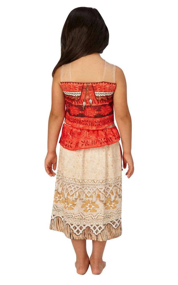 I AM MOANAAAAA! Dress up as the daring and adventurous Disney princess Moana. This deluxe licensed Moana costume for children includes printed dress with attached 3D necklace, detachable sash and flower hair comb.