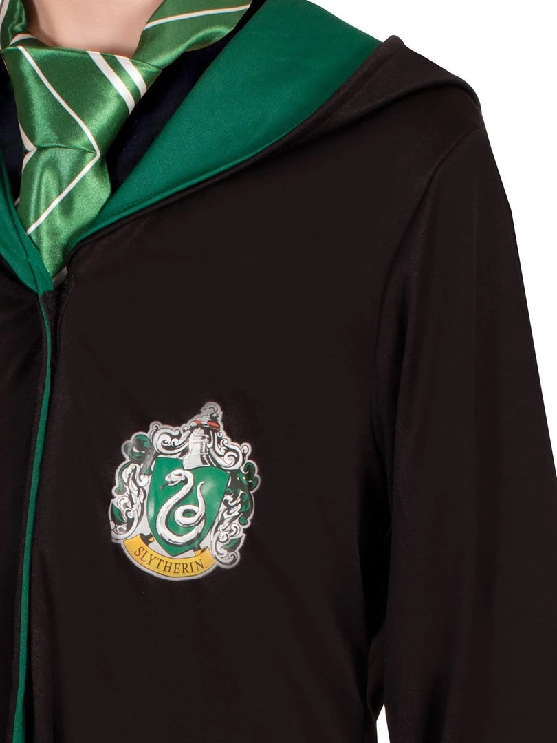 Children’s Hogwarts robe in Slytherin house colours. Black robe with hood lined in Slytherin green and Slytherin crest on front of robe. Harry Potter robes available from all four Hogwarts’ houses. Dress up for Book Week as Draco Malfoy or Severus Snape. Robe Only. All other accessories sold separately.