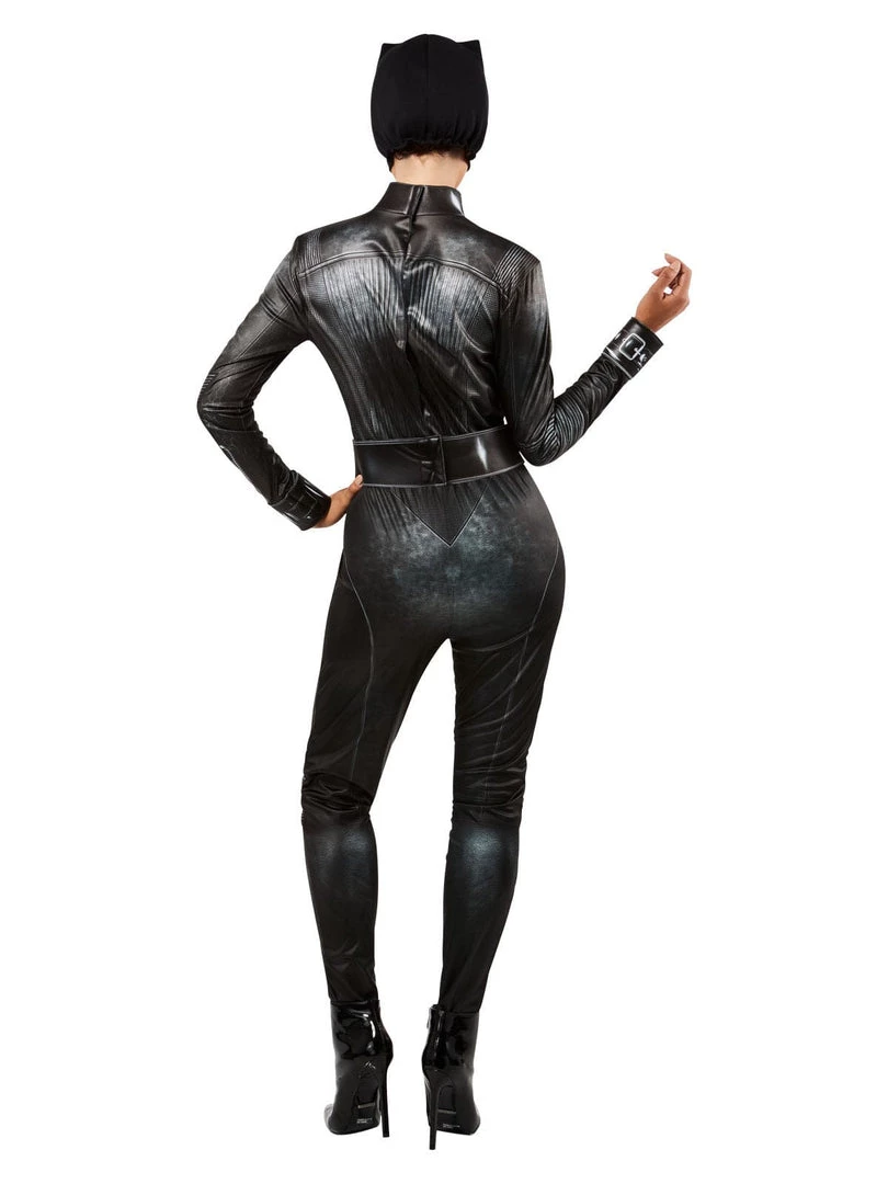 Slinky and sexy. The bane of Batman, and the object of his desires, Catwoman is the ultimate DC Comics superhero character. This Deluxe Selina Kyle Costume for Adults is from the latest The Batman movie, with Robert Pattinson and Zoe Kravitz. Digitally printed, shiny look fitted jumpsuit with foam backed collar and cuffs. Jumpsuit has textured knees and elbows and elasticized waist. Comes with belt and fleecy mask. This is an officially licensed DC Comics costume.