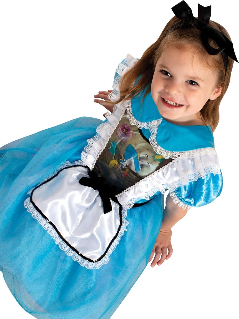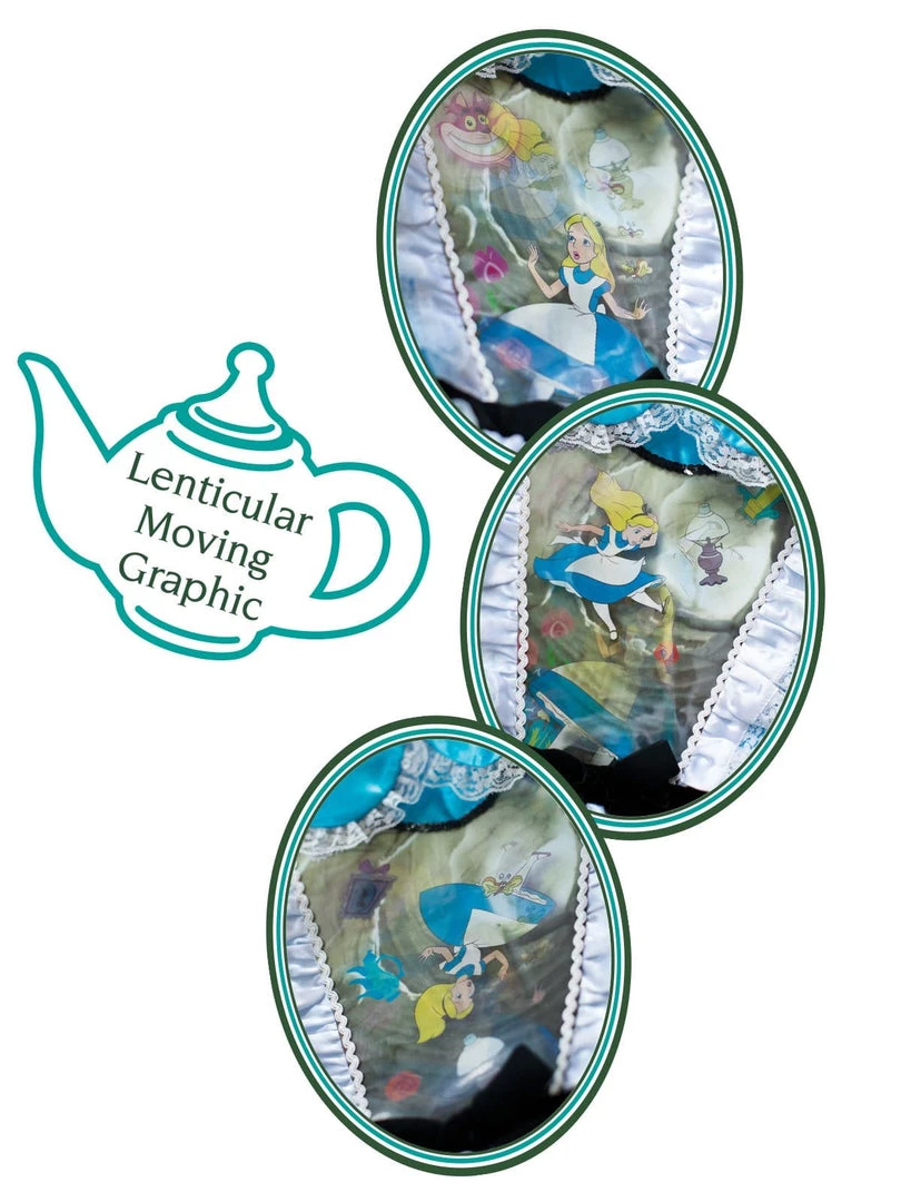 - Classic blue dress with satin bodice, featuring lenticular graphic panel at chest. Panel shows Alice falling down the rabbit hole with and garden imagery. Changes in light create a different visual