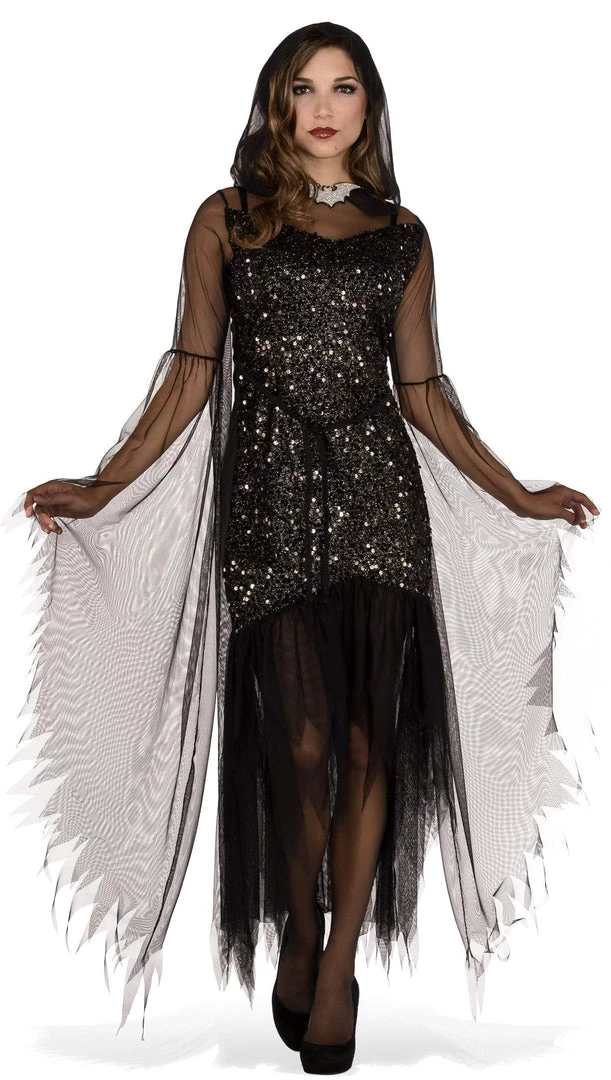- Dress has attached sheer hood and glittery silver bat brooch attached at collar