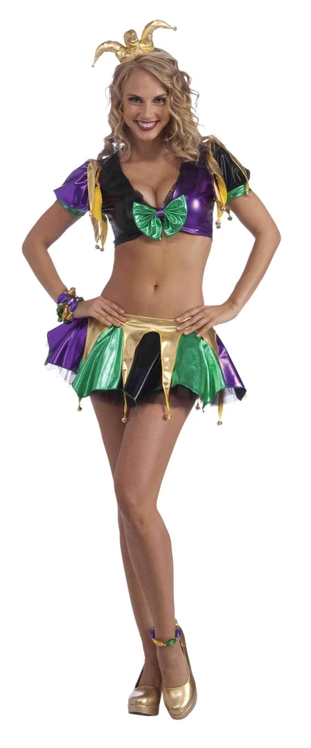 - Low cut bustier top in shiny metallic fabric with short sleeves and feature green bow at centre and small bells handing from shoulder tassels