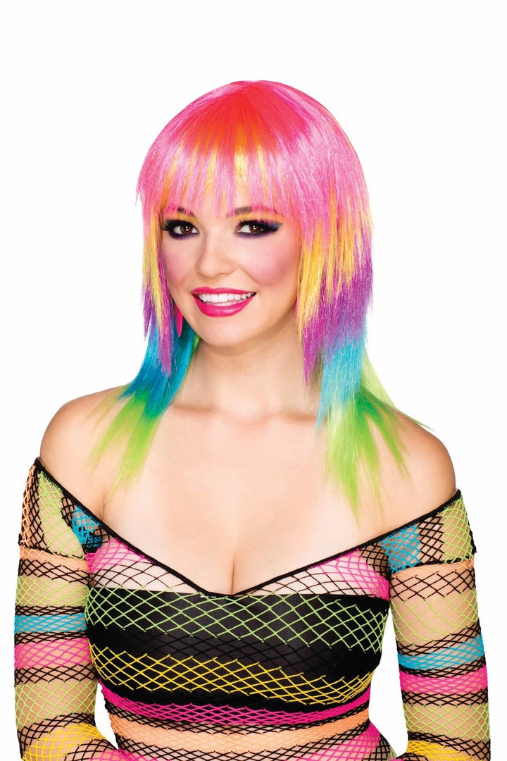 - Wig is styled with a fringe and rainbow ombre colour-waves from the fringe to the ends