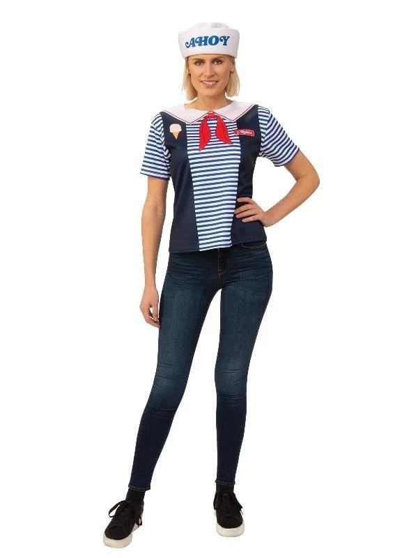 Robin Buckley, played by Maya Hawke she is fluent in three languages and good friends with fellow class-mate and colleague at Scoops Ahoy, Steve Harrington. An alternative girl, Robin is equal parts sharp and playful. Bored with her mundane day job, she just wants a little excitement in her life… and gets more than she bargained for when she uncovers a dark secret in Hawkins. Don the blue, red and white Scoops Ahoy uniform and see what unfolds.