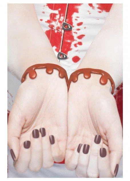 Bright red plastic fake slashed wrist blood drip bracelets. Accessorise with any costume at Halloween. Each packet contains a pair of bracelets. Please note: the colour is bright red, not brownish red like in the photo.