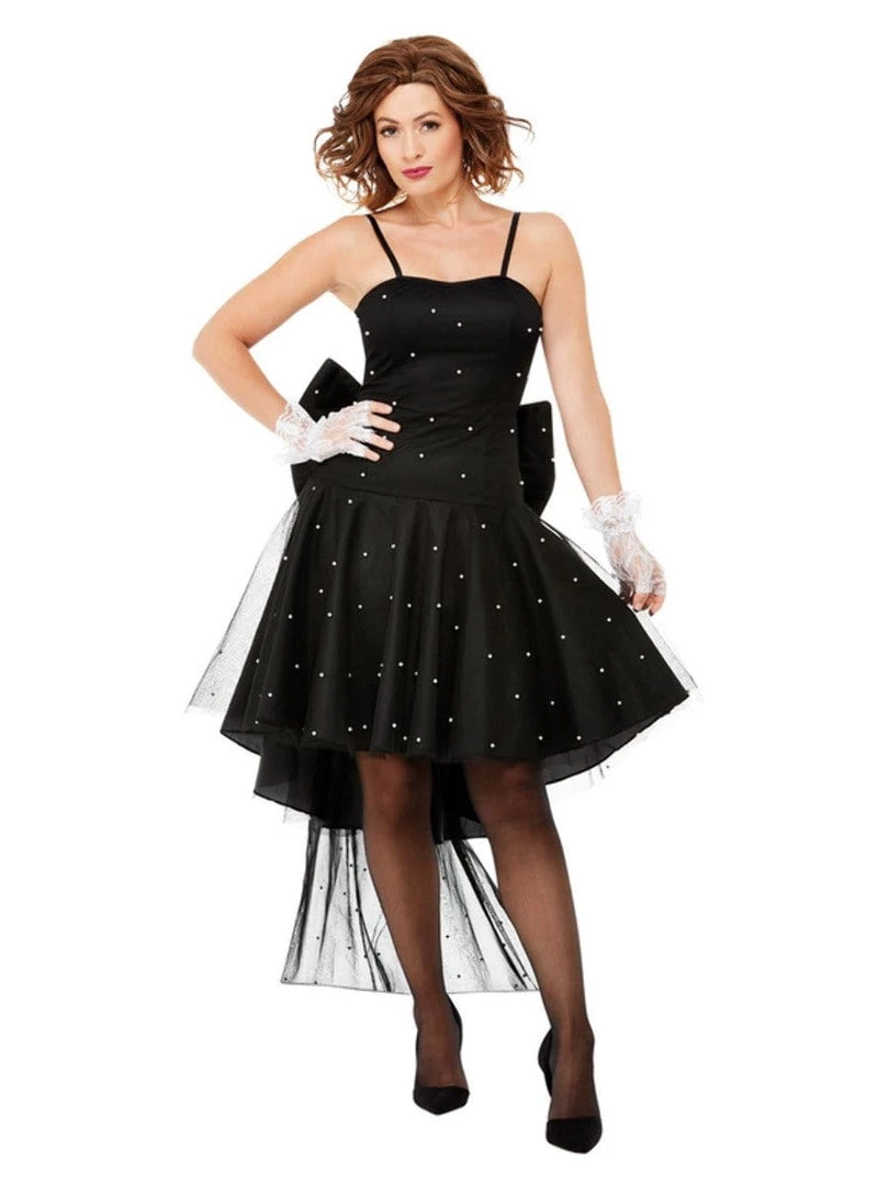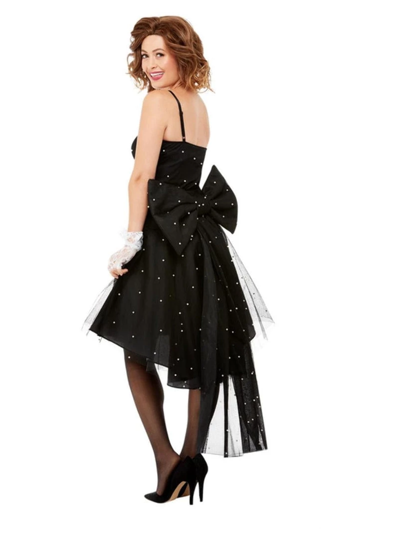 The ultimate 80s dress. The RaRa Dress was what every teenage girl aspired to wear to her high school formal in the 1980s. This Black Ra Ra Dress offers every iconic fashion feature that screamed style, taste and, like totally, rad, like. Stretch black drop waist dress with black tulle overlay scattered with white pearl beads. Dress has adjustable spaghetti straps. Skirt of dress is mullet style: shorter at the front, longer at the back and most essentially, has a giant oversize bow at the back