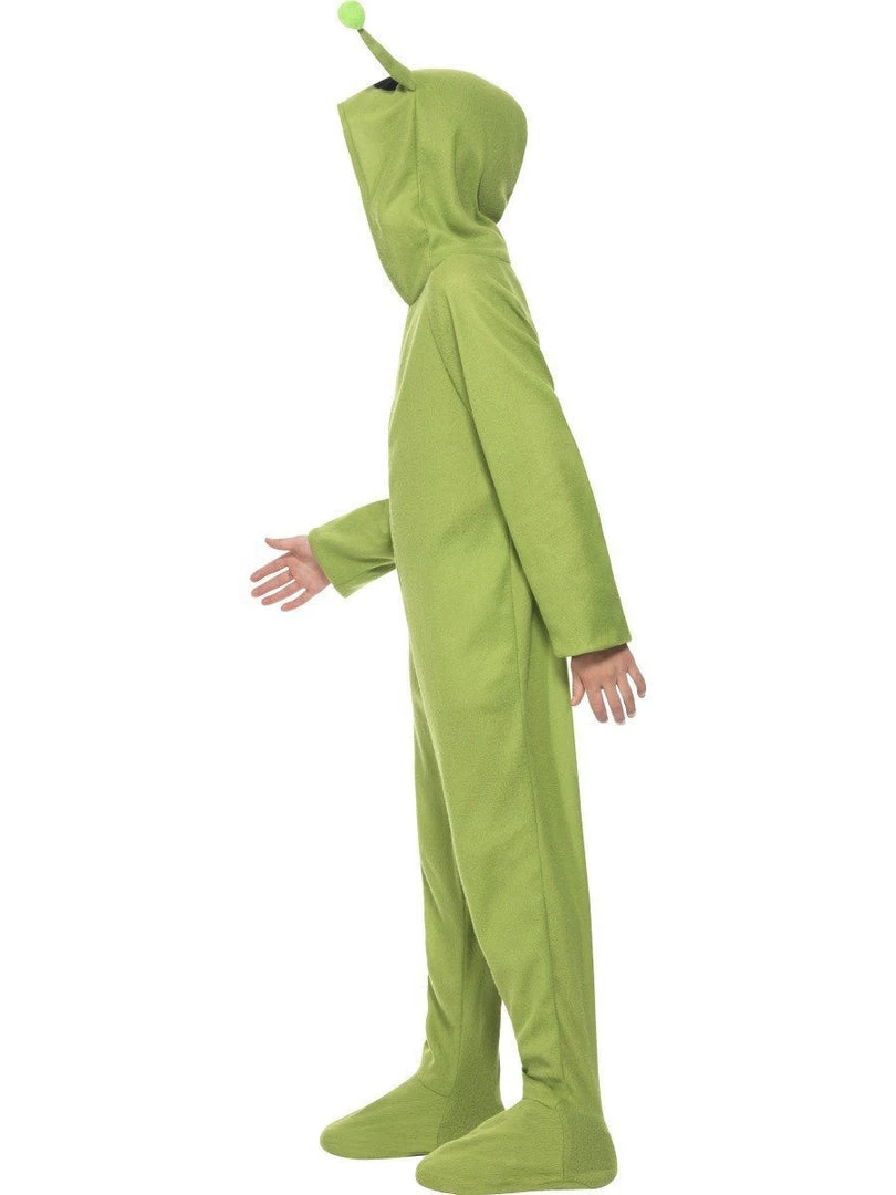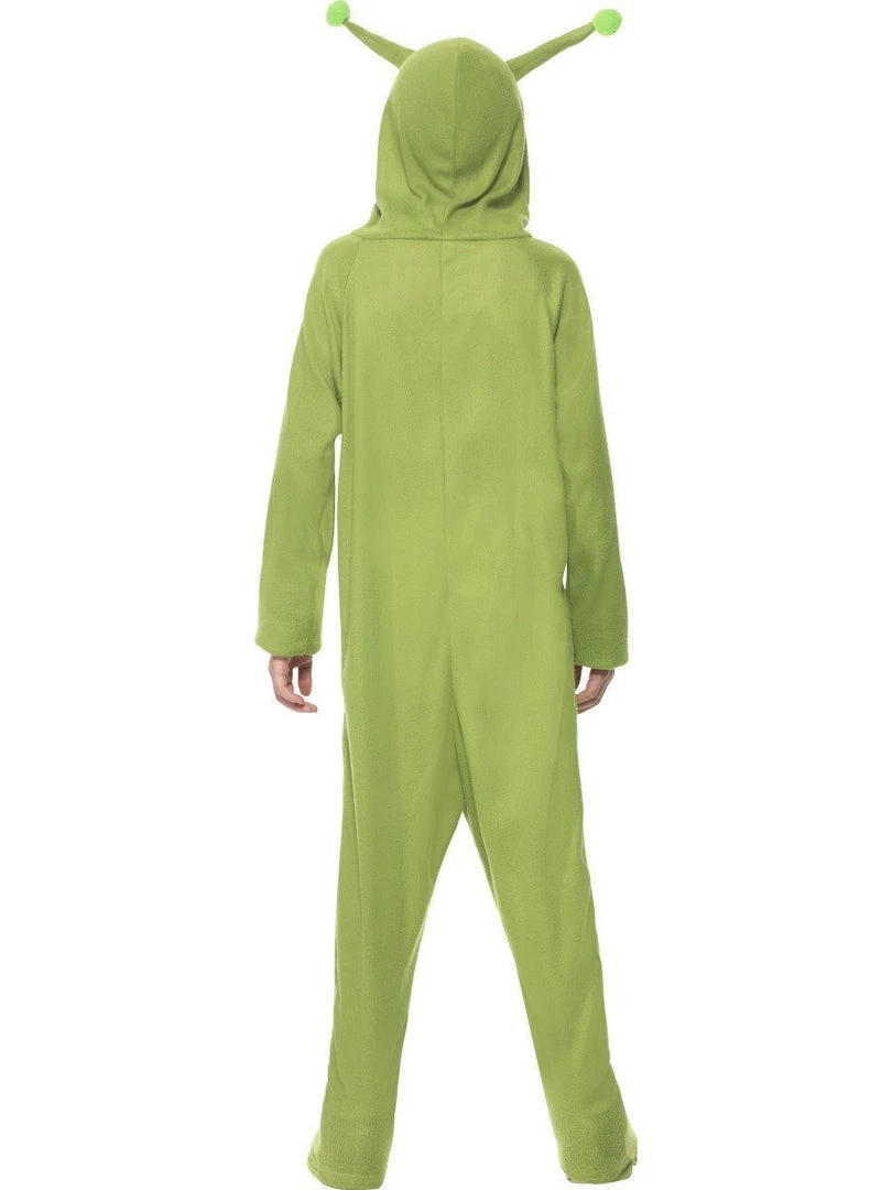 Take me to your leader. Friendly alien Book Week or Halloween costume for kids. Green onesie with attached alien hood with antenna. Face paint sold separately.
