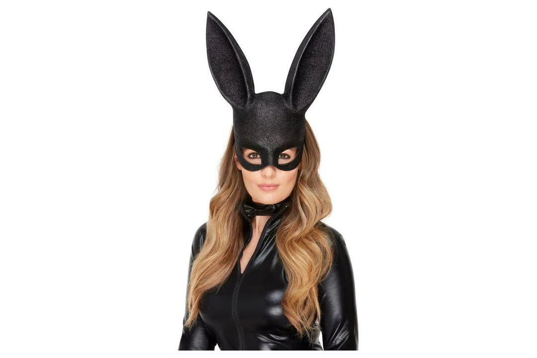Seductive Black Bunny Kit includes bunny mask with tall ears in black glitter and black shiny bow tie collar. Complete your sexy bunny look with wet look black jumpsuit.