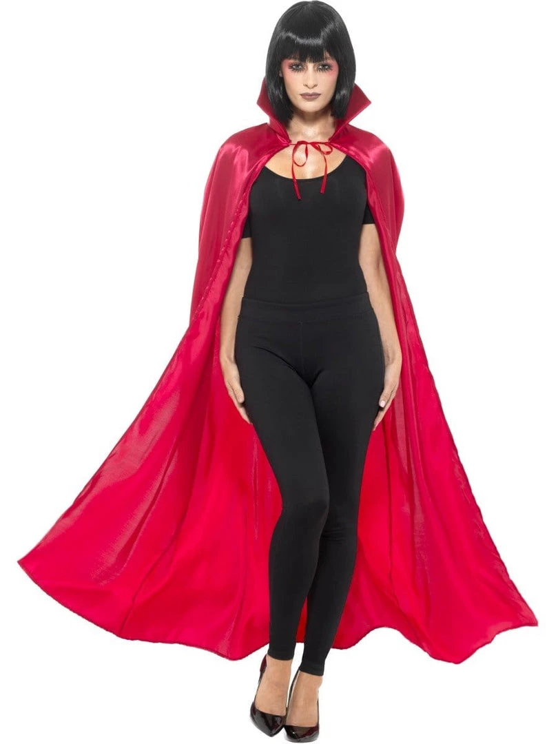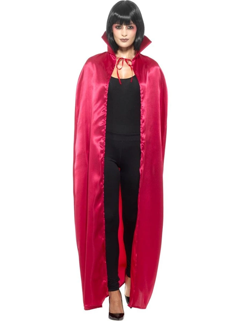 Long red satin cape with collar. Perfect cape to complete your devil costume at Halloween.