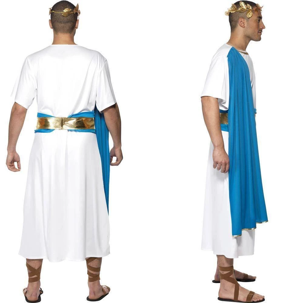 Hail Caesar! Handsome Roman toga costume in stunning white, bright blue and gold. A perfect match with our Roman Toga Costume for women. Costume includes: white gown with gold trim and blue drape, matching blue and gold belt and gold laurel headband. Roman sandals sold separately.