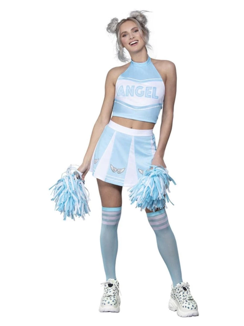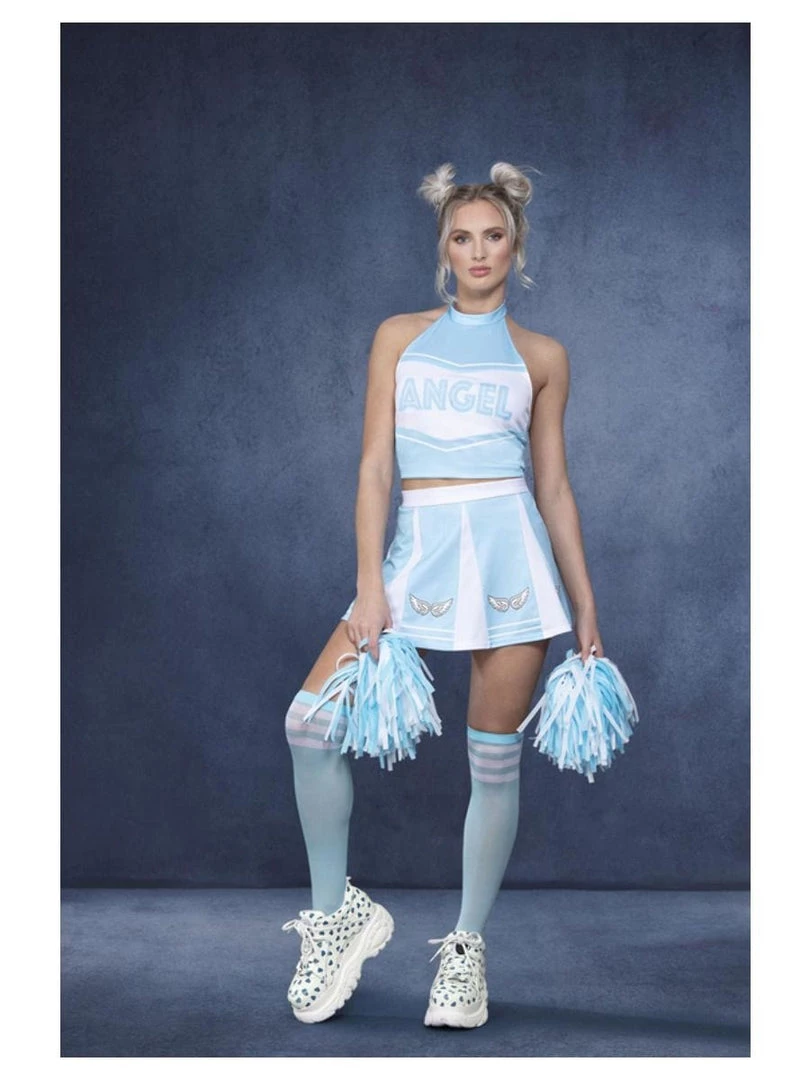Sweet but sexy Cheerleader costume for women. Pale blue and white cheerleader costume with Angel printed on crop top and angel wings on skirt. Comes with matching over knee socks and pom poms. Perfect for uniform parties.
