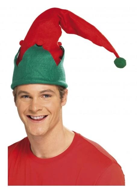 Long floppy red and green Christmas elf hat with attached pom poms. Accessorize with your Christmas or Christmas in July outfit. Perfect Secret Santa present. Also perfect for Book Week Fairy Tale elf, dwarf and gnome costumes.