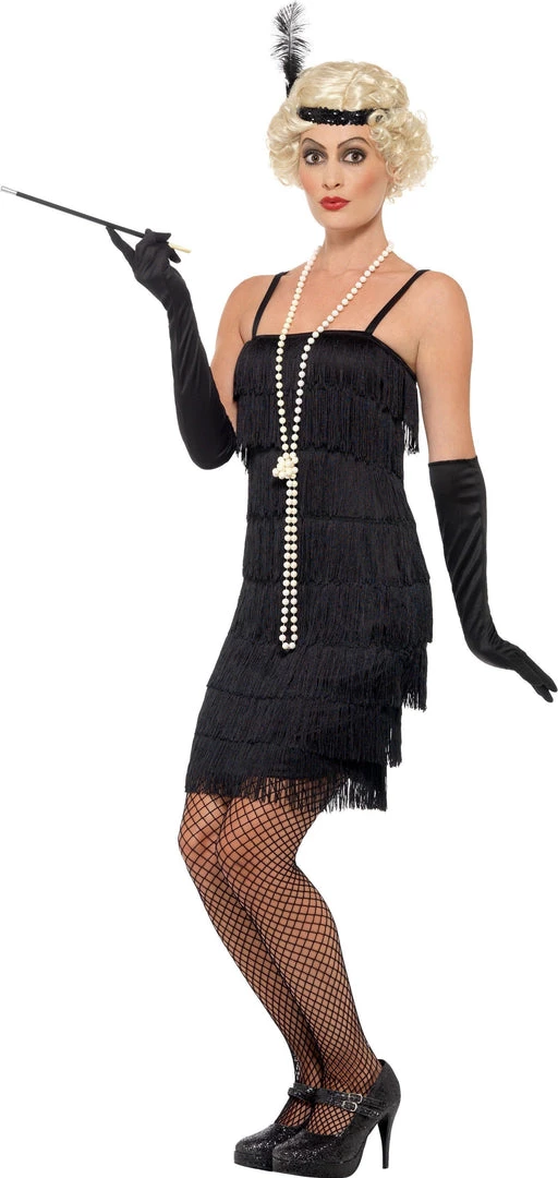 Classic 1920’s style fringed Flapper costume with slightly shorter hemline. This fun Gatsby inspired costume includes fringed black flapper dress, stretch sequin headband with feather and gloves. Wig, beads, feather boa, hosiery and all other accessories sold separately. Costume available in a range of sizes from S to XXL.