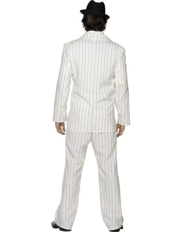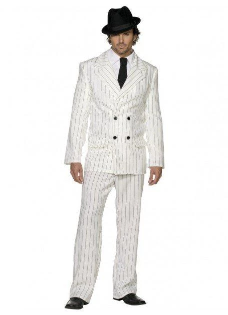 He’s one classy, smooth lookin’ bad guy. Look like Scarface in this white pin striped gangster costume suit. Costume includes trousers, jacket and tie. Shirt and hat sold separately.