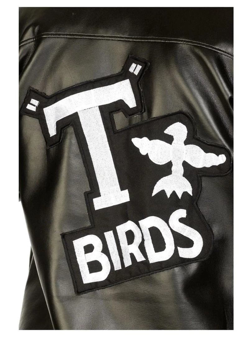 Black vinyl T-Birds jacket in women’s sizes. On front is embroidered Grease logo and the T Birds logo is on the back. This product is the jacket only. We also sell the complete costume and the Sandy curly wig.