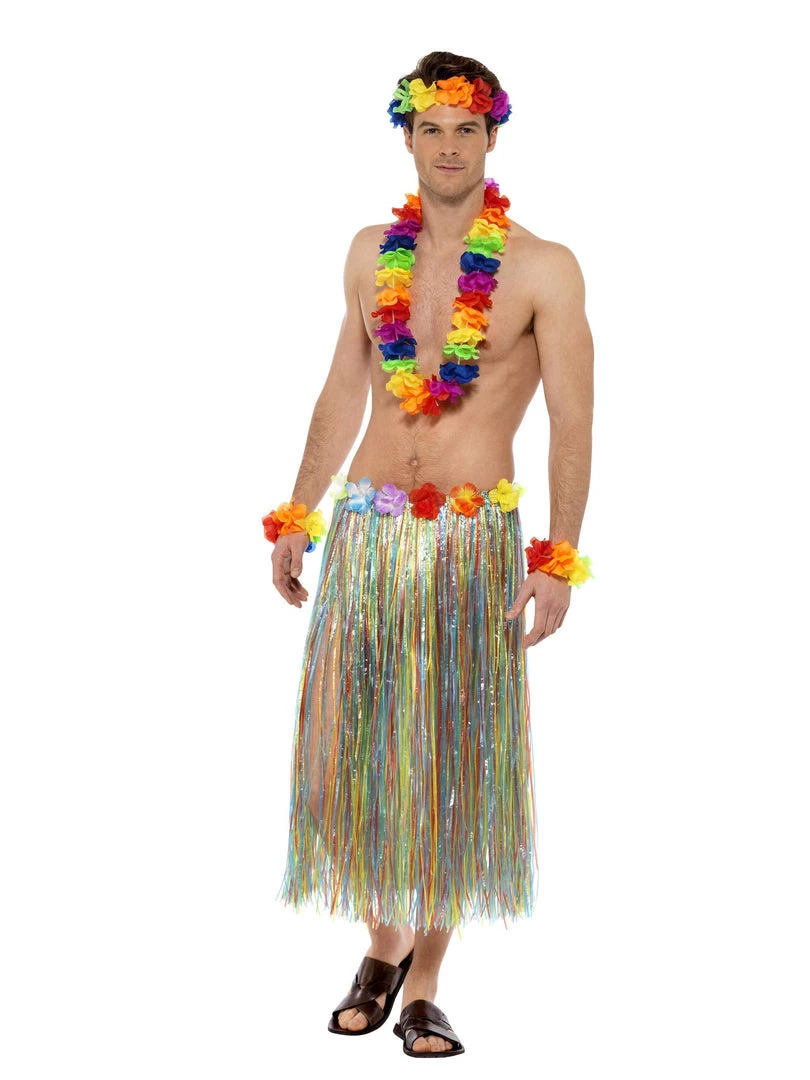 Brightly coloured 4 piece Hawaii Lei set. Set includes floral lei, headband and 2 wristbands in colours of the rainbow. Coconut bra and grass skirt sold separately. Suitable for men or women.