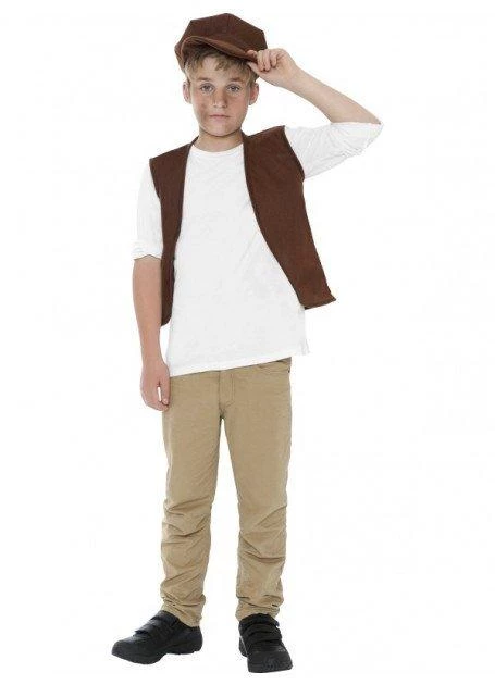 Please, sir, I want some more. This Victorian era urchin costume for boys is great for Charles Dickens’ Oliver Twist at Book Week and also for Australian colonial history recreations for school. Costume set includes brown waistcoat and matching cap only.