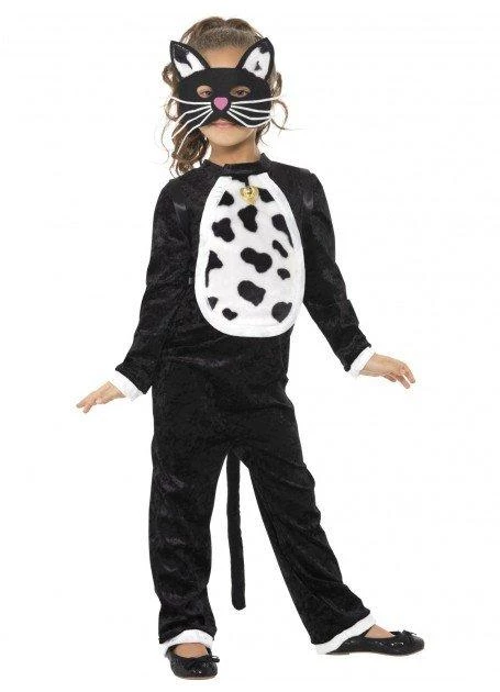 Black and white cat jumpsuit for kids. Adorable costume includes black stretch jumpsuit with spotty chest and kitty bell at neckline, matching mask and detachable tail. Cute for Book Week cat characters and perfect at Halloween.