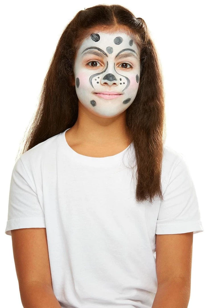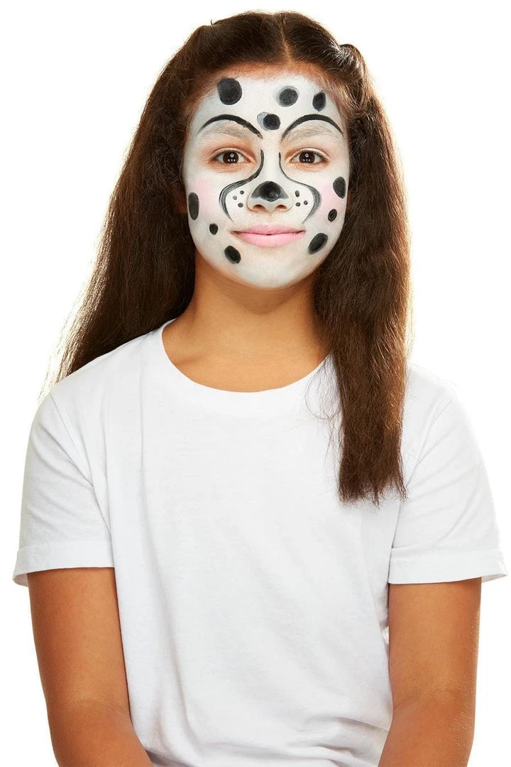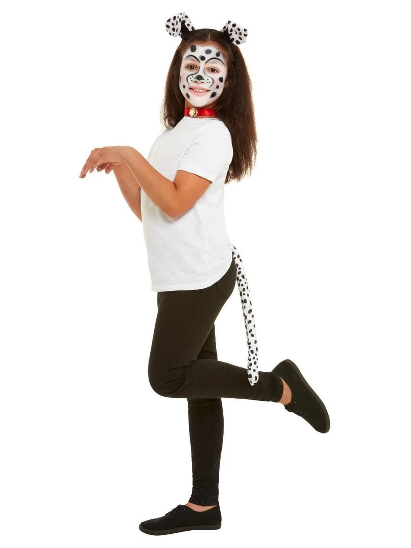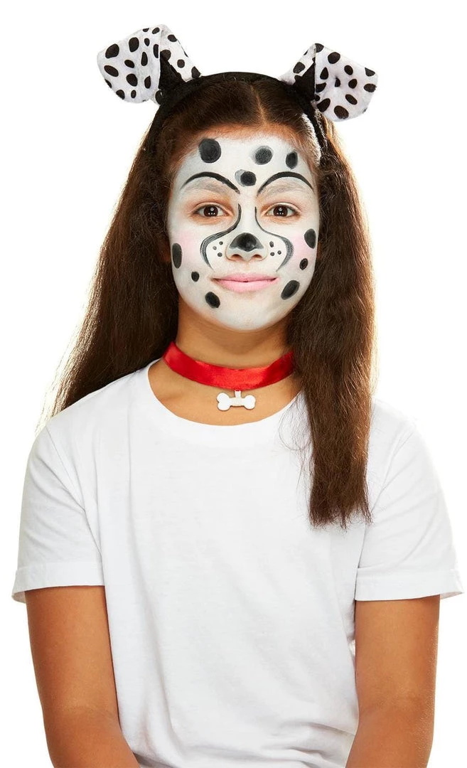 Kids Dalmatian Set includes black and white dog ears on headband, matching spotty tail, collar, black and white colour make-up set, brush applicator and sponge. Package shows step by step photos. Simple, quick Book Week costume. Dress your child up as a cute puppy from 101 Dalmatians.