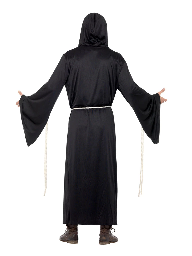 Long black adult size hooded robe for all sorts of characters at Halloween, including Grim Reaper, Scream, Plague Doctor, Demons, Ghouls and other creepy souls. Also suitable for Star Wars Sith characters. Black hooded robe with long wide sleeves and rope belt. Make-up and any other items sold separately.