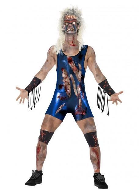 Zombie Wrestler Halloween costume for adults. Costume includes short bodysuit with photo look fake wounds and blood, half mask for face and knee and arm cuffs with fake blood stains. Wig, make-up and all other accessories sold separately.