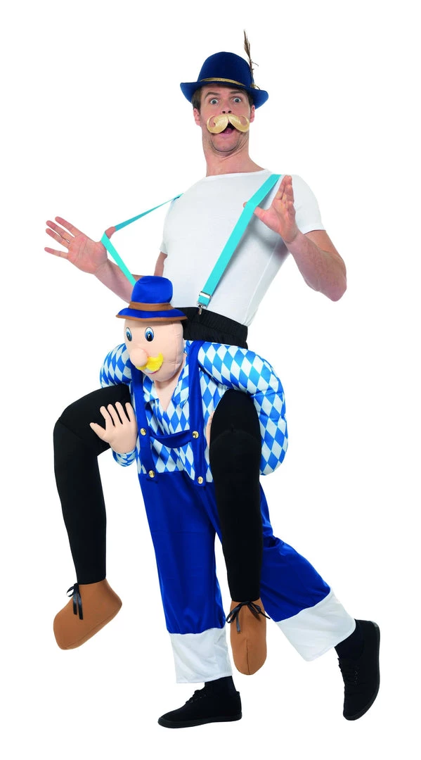 Ja, you will have so much fun at Oktoberfest getting a piggyback from your little German mate Hans. Take it easy as Hans carries you around from pretzel stand to beer stand. This Piggyback Bavarian Costume is a one piece suit with mock legs. Model is wearing his own t-shirt and braces. Waistband of costume has draw string to hold tight. Buy the matching Oktoberfest hat and fake moustache to match Hans.