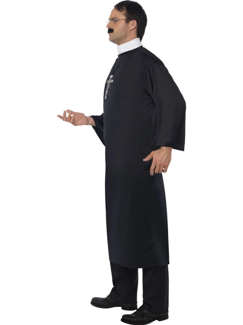 Classic Priest Costume for fancy dress and costume parties. Perfect for Halloween, Vickers and Tarts parties, Priests and Nuns. Costume is long black robe with attached white collar. Pants not included. Cross and all other accessories sold separately.