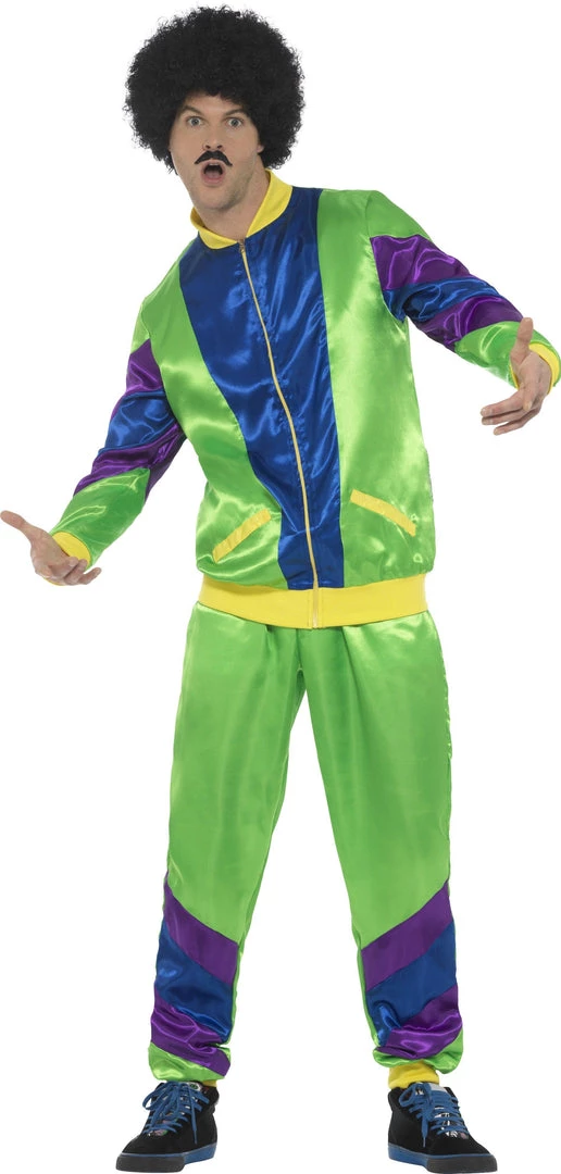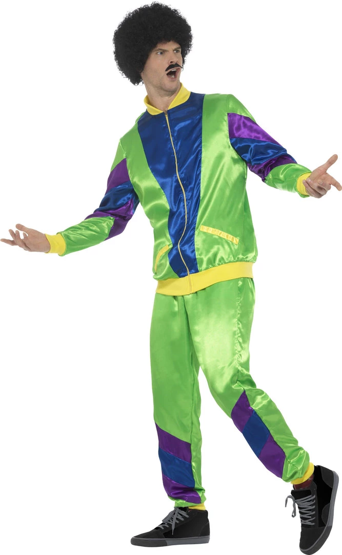 Slip on the trackie daks and zip up the jacket and join the fitness craze from the 1980s in this retro 80s men’s tracksuit. This iconic shell suit look is perfect for hip hopping and breakdancing. Classic active wear look for Kel from Kath and Kim to go power walking in around the ‘burbs. Costume is green and yellow and blue and purple two piece polyester tracksuit: top and pants. Wig and all other accessories sold separately.