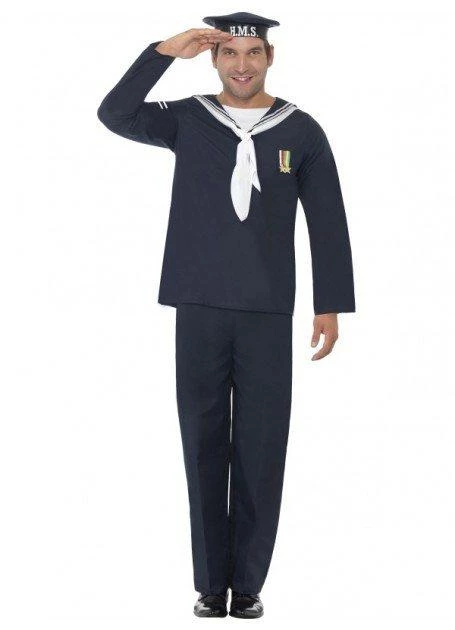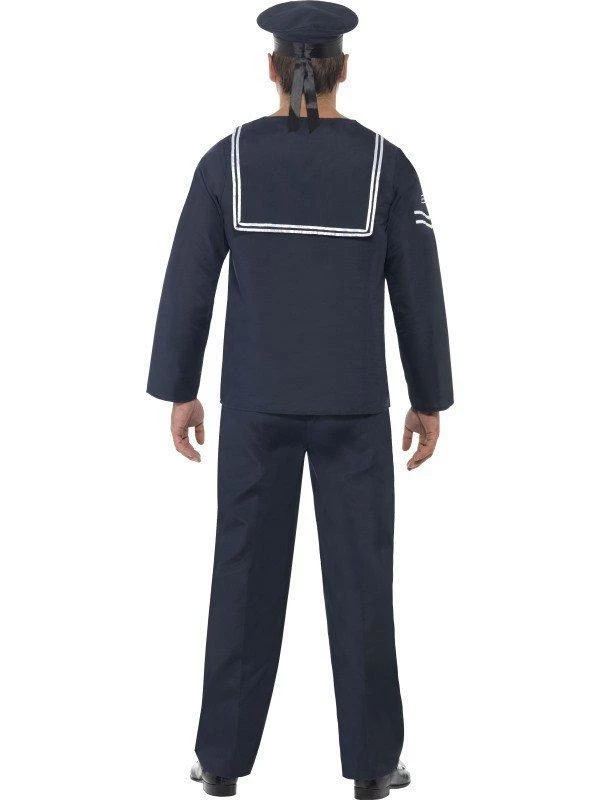 Classic sailor costume for men. Costume is vintage style uniform of navy blue shirt with attached scarf, matching trousers and hat.