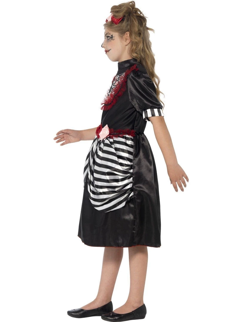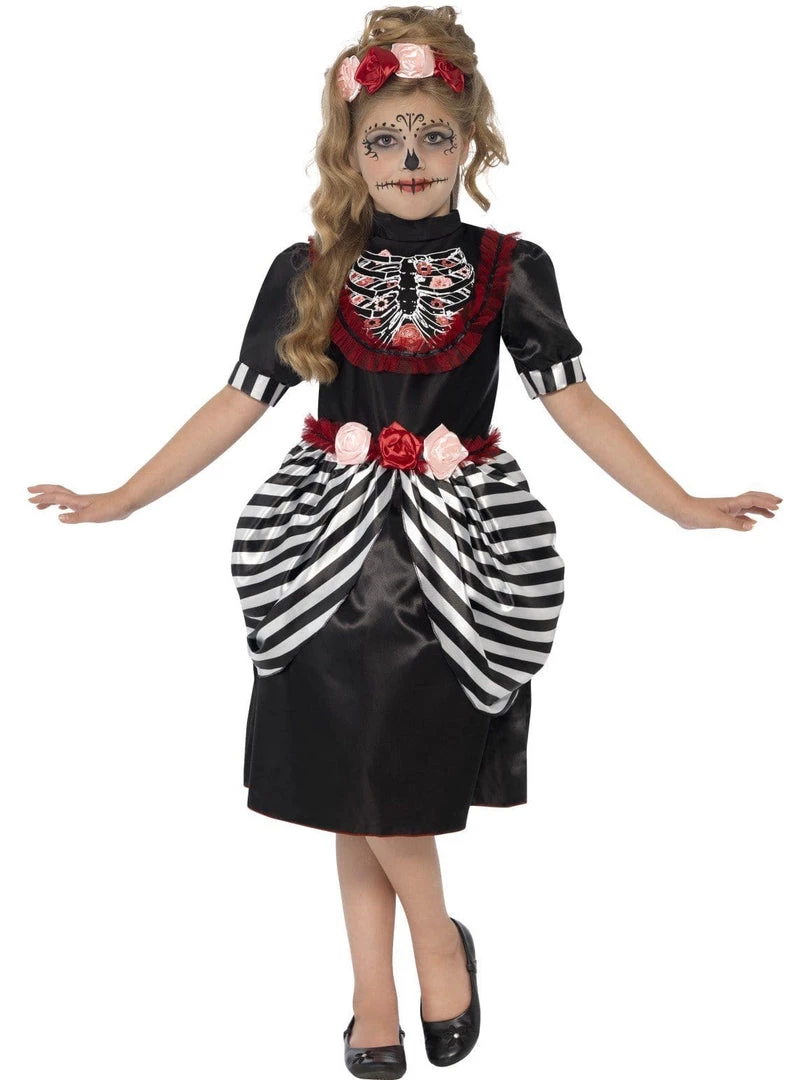 To die for adorable girls Sugar Skull Mexican Halloween costume. Cute little dress with black and white striped peplum and trimming on the sleeves, pretty flower belt, flower rib cage print on the chest and a gorgeous rose head band to match. Finish off this adorable costume with Sugar Skull make-up. Dress and headband only.