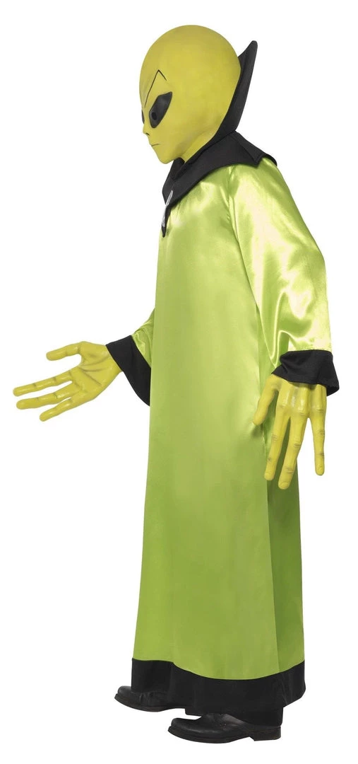 Alien Lord Adult Science Fiction Halloween Costume includes lime green gown with oversized black collar, green alien mask and matching large alien hands.