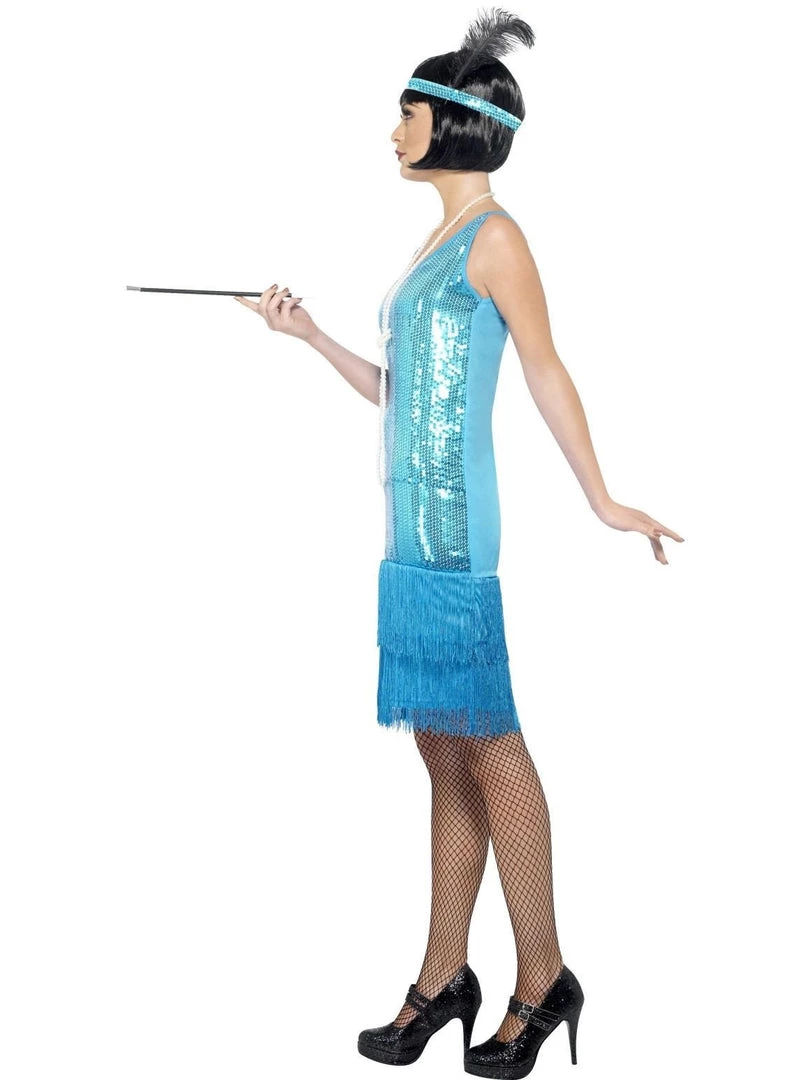 Flirty and fun bright blue sequin flapper costume. Great for Gatsby themed fancy dress parties, this classic 1920s costume includes sequin dress with fringing, matching headband and long strand of beads. Wig, cigarette holder, feather boa, fishnets all sold separately to complete your 20s look. Also available in hot pink.