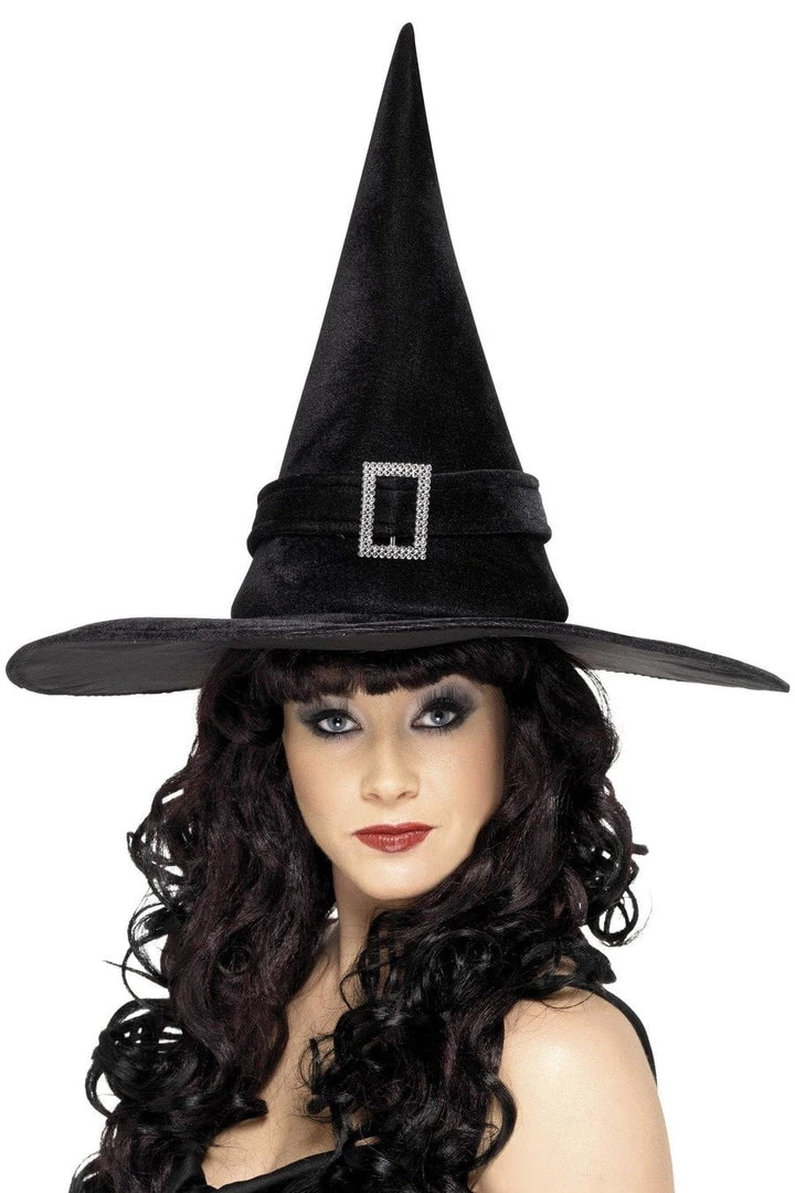 Black velveteen pointed witch hat with silver diamonte look buckle on hat band. The essential Halloween accessory.