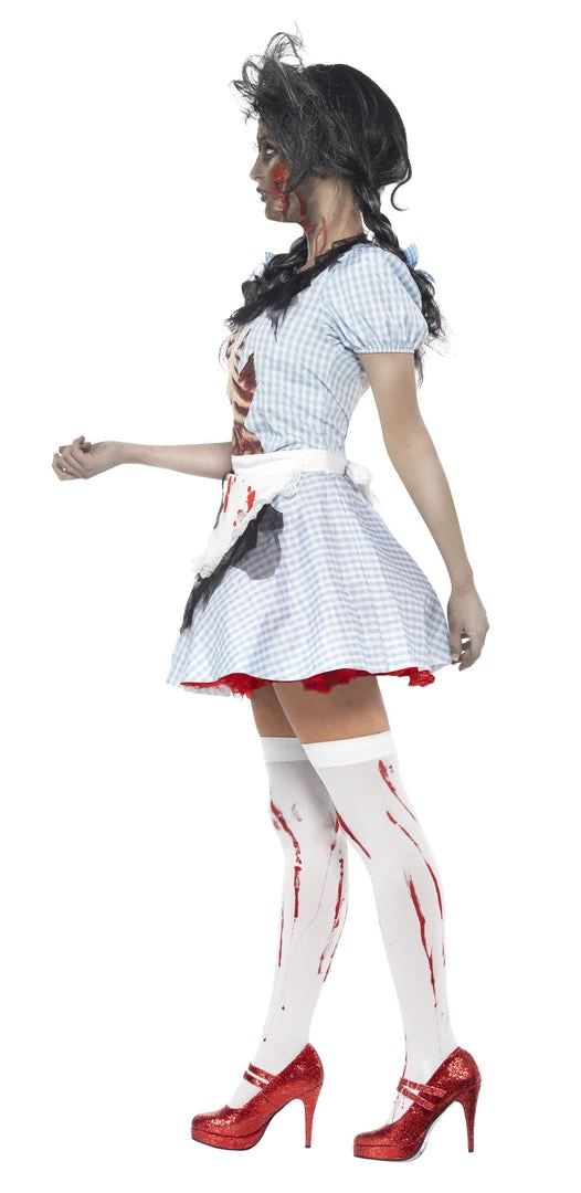 Zombie apocalypse meets the Wizard of Oz in this Zombie Country girl Halloween costume for women. Blue and white gingham dress just like Dorothy, but with rips, fake blood stains and exposed ribs and zombie flesh. Comes with fake blood splattered apron. Run Toto run! Dress and apron only. All other items sold separately.