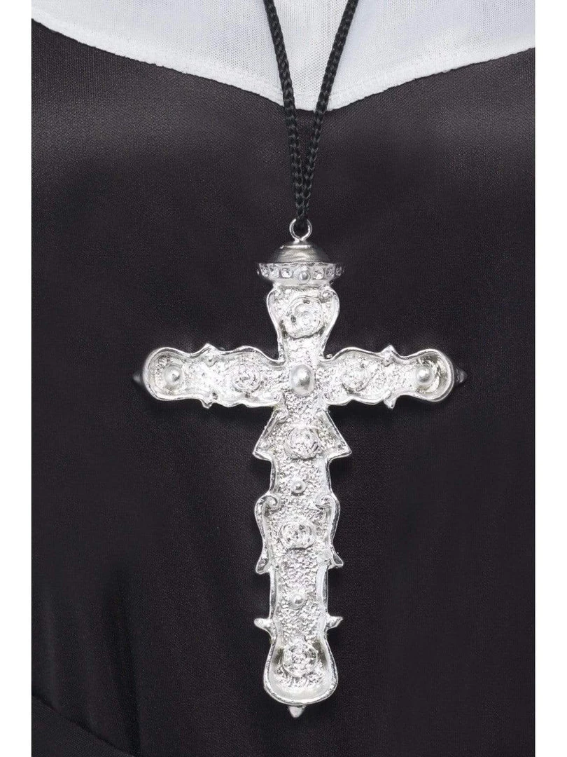 Light weight ornate cross pendant in silver colour. Plastic pendant on black strand. Perfect accessory to complete your priest or nun costume or to bling up a 70s disco or gangster pimp costume.Â