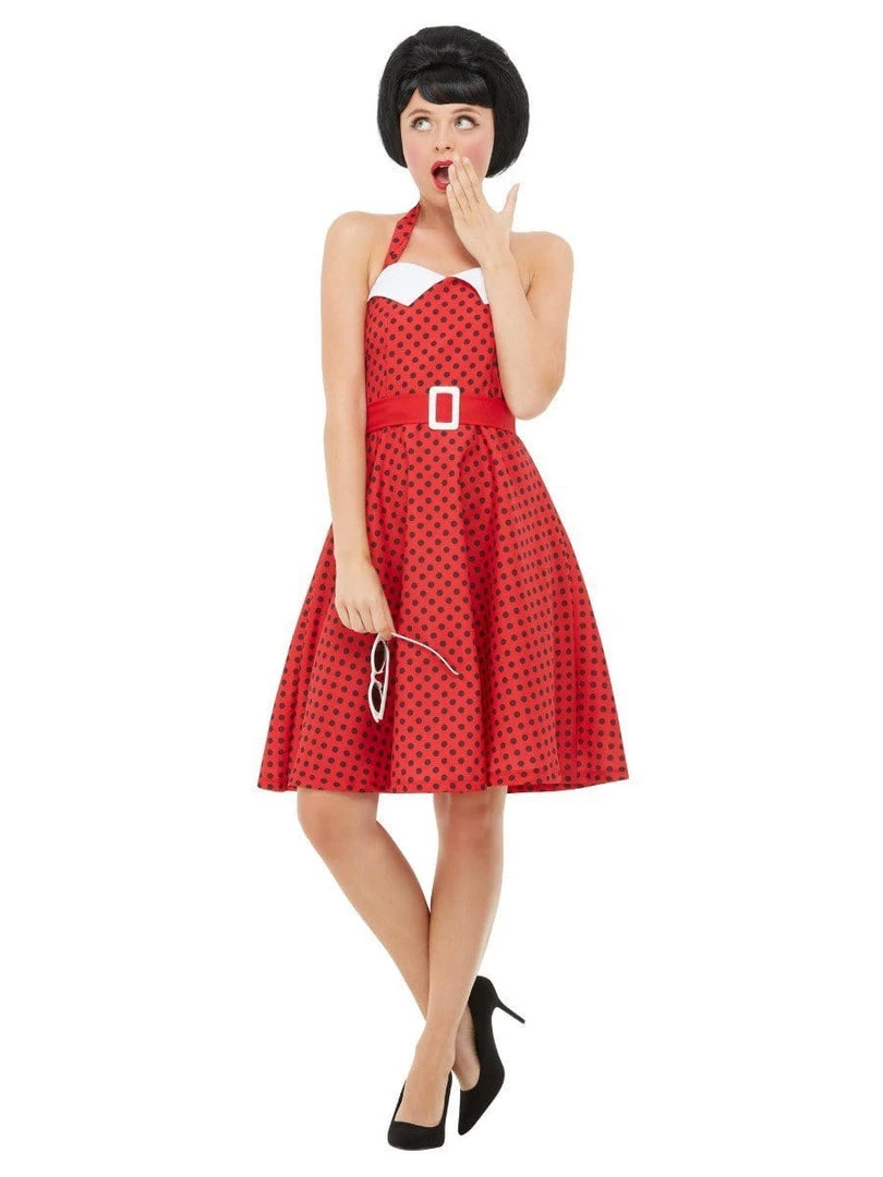 Be ready to dance the night away at your next 1950’s party wearing this 50’s Rockabilly Dress Costume. This cute red polka dot rockabilly fancy dress has black polka dots on the front and back with a zipper in the side and has a stretch elastic in the back. The dress features a classic halter neck style with white folded down front collar and attached red belt with white buckle.